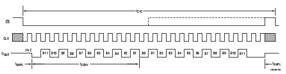 LTC1287提供了一个内置的采样和保持(S&H)单通道中采集信号的+IN输入功能结束模式(引脚接地)。取样和保存允许LTC1287转换快速变化的信号(请参阅S&H典型性能特性曲线采集时间与源电阻)。输入电压在tSMPL时间内采样,如图8所示。这个采样间隔从CS上升沿开始并持续直到CLK的下降沿才转换开始。在这个下降沿,S&H进入货舱模式,转换开始。