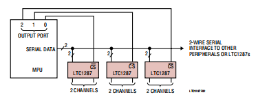 LTC1287可以共享同一个双线串行接口其他外围组件或其他LTC1287(图2)。在这种情况下,CS信号决定LTC1287正在由微处理器处理