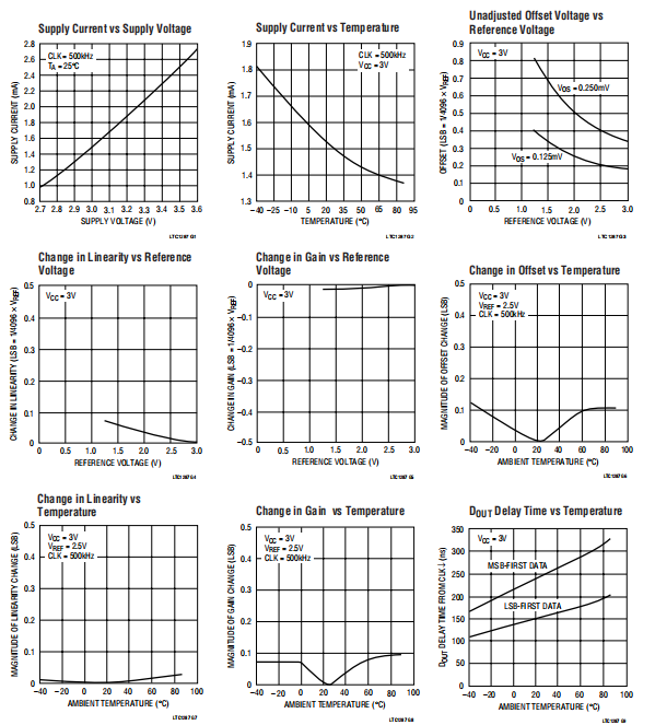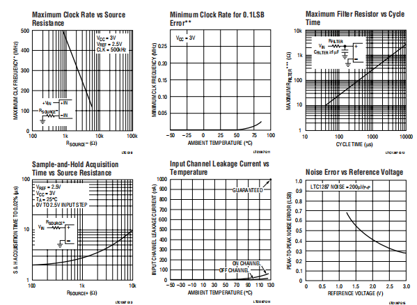 LTC1287的总输入参考噪声可以是使用地平面,良好的旁路,良好的布局技术以及最小化参考输入的噪声。这个噪声在2.5V参考输入下是微不足道的,但是成为LSB的一个更大的部分作为LSB的大小减少了。典型的性能特征噪声误差与参考电压的关系曲线显示200μV噪声的LSB贡献。在2.5V参考电压下运行时,200μV噪声为峰间只有0.32LSB。这里是LTC1287噪音几乎不会对产出造成不确定性代码。对于减少的参考,噪声可能变成LSB的重要部分,并导致不良反应输出代码抖动。例如,1.25伏参考,该200μV噪声峰间为0.64LSB。这将减小输入电压的范围用0.64LSB可获得稳定的输出码。现在可能需要平均读数。这些噪音数据是在一个非常干净的测试夹具中采集的。任何设置引起的噪声(VCC、VREF上的噪声或波纹或VIN)会增加内部噪音。越低的参考电压越高有一个无噪音的设置。