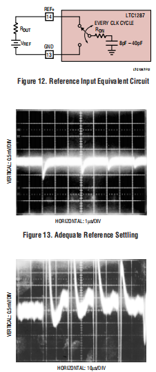 图13和14显示了适当和沉降差。使用较慢的CLK将允许更多的时间以供参考结算。即使在最高时钟500kHz的速率大多数参考和运算放大器可以使其在2μs位时间内沉降。例如带有4.7μF旁路电容器的LT1790将沉降充分。