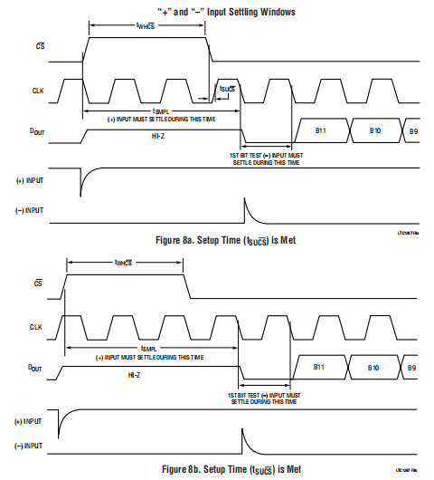 “+”输入设置输入电容器在取样阶段(tSMPL,见图8a、8b和8c)。这个采样周期可短至tWHCS+0.5 CLK周期或只要tWHCS+1.5 CLK循环后再转换开始。这种变化取决于CS的相对位置给CLK。“+”输入上的电压必须完全稳定在样本期内。最小化RSOURCE+和C1会缩短沉降时间。如果输入源大“+”ATIO应用程序必须使用电阻,可以增加采样时间使用较慢的CLK频率。用最小值可能的采样时间为6.0μs,RSOURCE+<4.0k和C1<20pF将提供足够的沉降时间。“–”输入设置在采样阶段结束时,输入电容器切换输入“–”并开始转换(参见图8a,8b和8c)。在转换过程中,“+”输入电压为