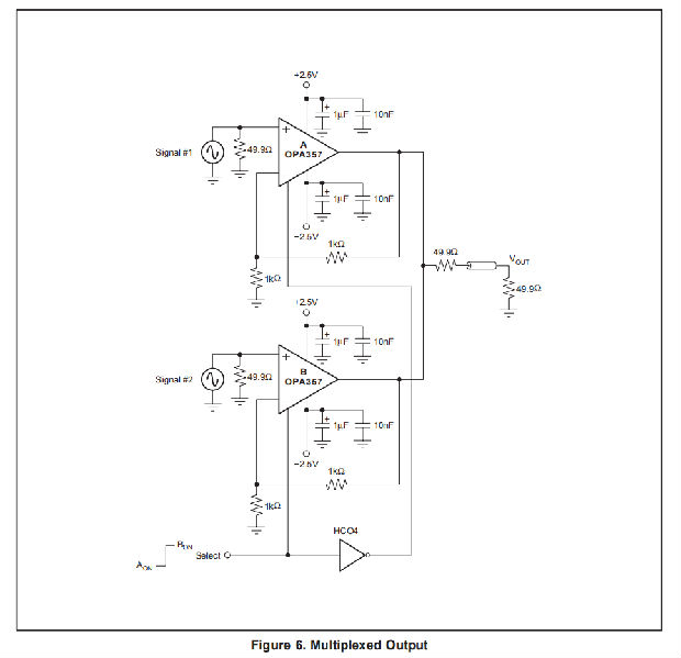 视频速度放大器的一个常见应用是将多个放大器输出连接在一起,然后从几个可能的视频输入中选择哪一个输入到一条线路上。这个简单的有线或视频多路复用器可以使用OPA357轻松实现;见图6。