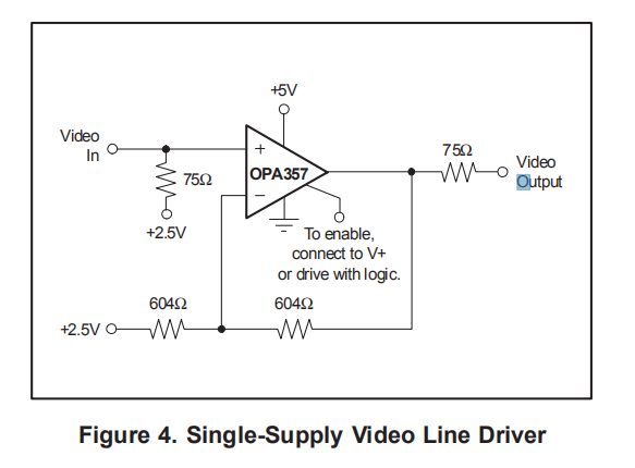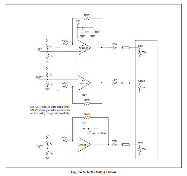 OPA357可以用作RGB图形信号的放大器,该信号在视频黑电平下的电压为零,通过对信号进行偏移和交流耦合。见图5。