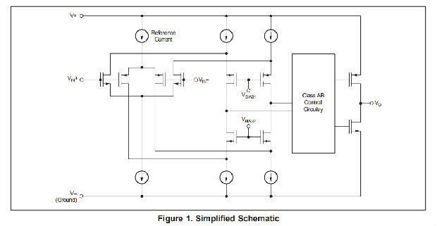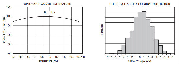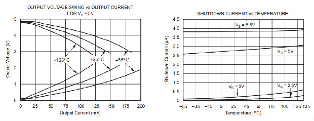 AB类输出级采用共源晶体管实现轨对轨输出。对于高阻抗负载(>200Ω),输出电压摆幅通常为离电源轨100毫伏。当负载为10Ω时,可以在保持高开环增益的同时实现有用的输出摆幅。见输出电压摆幅与输出电流的典型特性曲线。