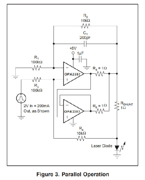 OPA357的输出级可以提供±100mA的连续输出电流,并且在5V电源上仍然提供大约2.7V的输出摆幅,如图2所示。为达到最大可靠性,不建议运行超过±100mA的连续直流电流。参考典型的输出电压摆幅与输出电流的特性曲线。为了提供大于±100mA的连续输出电流,OPA357可并联运行,如图3所示。