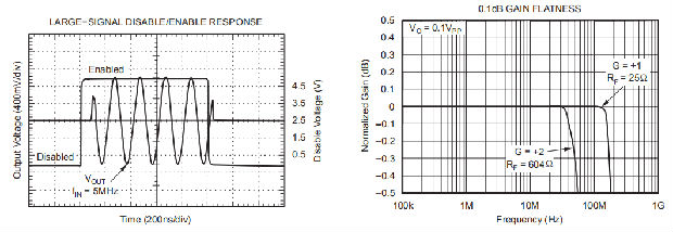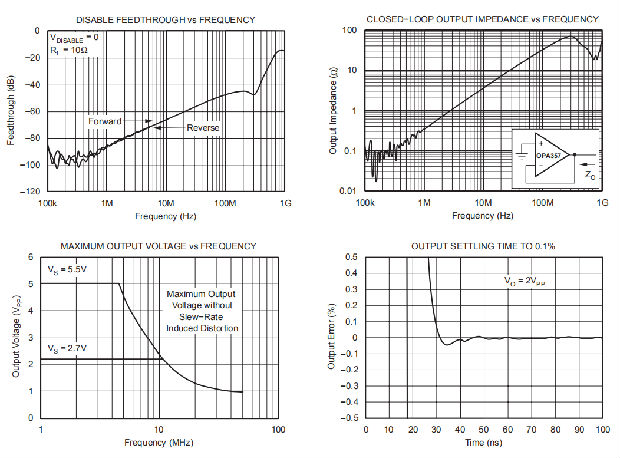 启用时间为100ns,禁用时间仅为30ns。这使得OPA357可以作为门控放大器工作,或者将其输出多路复用到公共输出总线上。禁用时,输出假定为高阻抗状态。
