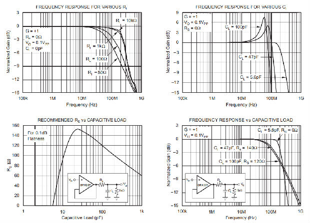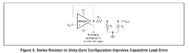 OPA357的拓扑结构增强了它驱动电容性负载的能力。在单位增益,这些运算放大器表现良好的大电容负载。详见推荐的典型特性曲线RS vs电容性负载和频率响应vs电容性负载。