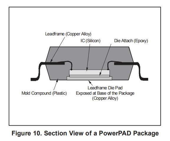 PowerPAD封装的设计使得引线框架模具垫(或热垫)暴露在IC底部,如图10所示。这在模具和封装外部之间提供了极低的热阻(JC)路径。集成电路底部的热垫直接焊接到PCB上,使用PCB作为散热片。此外,电镀通孔(过孔)为PCB背面提供了一条低热阻热流道。
