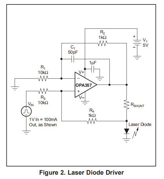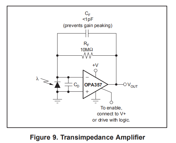 对于更高的跨阻带宽,可以使用高速CMOS OPA355(200MHz GBW)或OPA655(400mhzgbw)。