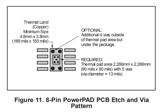 3、在热垫区域放置推荐数量的电镀通孔(或热通孔)。这些孔的直径应为13密耳。它们保持很小,这样在回流焊期间,通过孔的焊料芯吸不是问题。SO-8PowerPad封装的最小建议孔数为5,如图11所示。