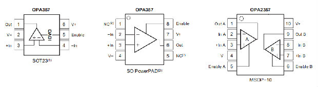 单一版本(OPA357)采用微型SOT23-6和SO-8 PowerPAD封装。双版本(OPA2357)在MSOP-10软件包中提供。