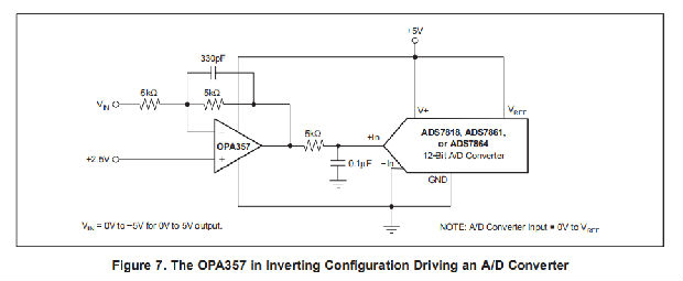 驱动A/D转换器的OPA357见图7。在OPA357处于逆变配置的情况下,反馈电阻器上的电容器可用于过滤信号中的高频噪声;见图7。