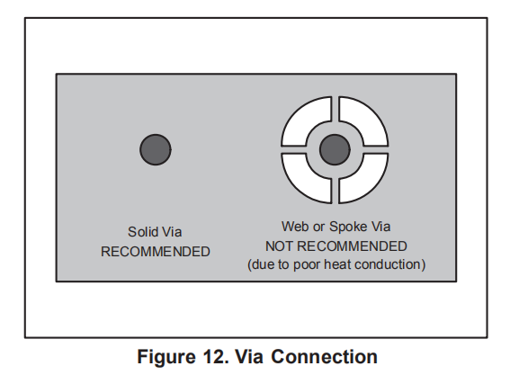6、当布置这些孔时,不要使用典型的webor spoke via连接方法,如图12所示。网络连接有一个高热阻连接,有助于减缓焊接过程中的热传递。这使得焊接具有接地平面连接的过孔更加容易。然而,在这种应用中,低热阻是最有效的传热要求。因此,PowerPAD组件下的孔应与内部接地平面连接,并在整个电镀通孔周围进行完整连接。