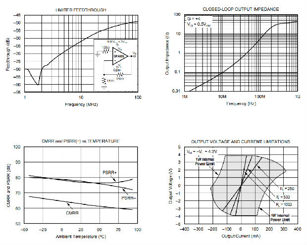 OPA699是一个电压反馈,增益为+4V/V的稳定运算放大器。输出电压限制在限制器引脚(5和8)上的电压设置的范围内。当输入试图过驱动输出时,限制器控制输出缓冲器。限制器的这一动作避免了信号通路的任何部分饱和,在任何信号增益下都能实现快速的超速恢复和良好的限制器精度。限制器从线性工作区到输出限制有一个非常尖锐的过渡。这种转换允许限制器电压设置在非常接近(<100mV)的期望信号范围。在限制器电压附近,失真性能也很好。