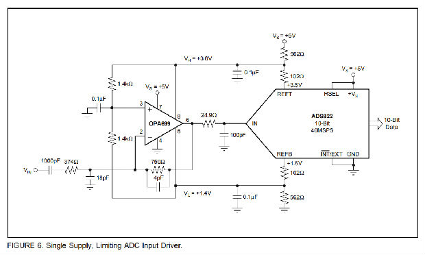 图6显示了一个简单的ADC驱动程序,它在单个电源上工作,并提供了出色的失真性能。极限电压跟踪转换器的输入范围,完全防止输入过驱动。注意,限制电压已设置为高于/低于转换器相应参考电压100毫伏。该电路还利用外部补偿实现了一种改进的失真,使反向增益为–2。