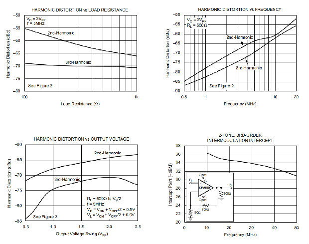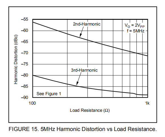 OPA699失真性能是为500Ω负载(如ADC)指定的。如图15所示,阻力较小的驱动荷载会增加变形。记住在负载电阻计算中包括反馈网络。