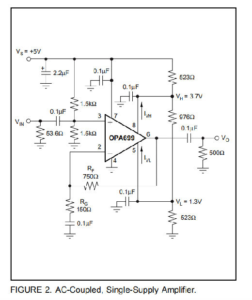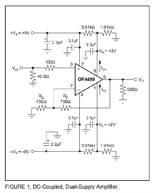 图2显示了一个交流耦合,非转换增益放大器,用于单+5V电源操作。该电路用于OPA699的交流特性,电源为50Ω(与之匹配),负载为500Ω。非换向输入上的中点参考由两个1.5kΩ电阻器设置。这就产生了一个输入偏置电流抵消电阻,与在逆变输入处看到的750Ω直流电源电阻相匹配(请参阅直流精度和偏移控制部分)。电源的电源旁路由两个电容器组成:一个是2.2μF的电解电容器,一个是0.1μF的陶瓷电容器。电源旁路电容器在图1和图2中明确显示,但在其他图中会假定。限制器电压(VH和VL)以及各自的偏置电流(IVH和IVL)具有所示的极性。这些限制器电压通过0.1μF陶瓷电容器充分绕过。注意,单电源电路可以使用三个电阻来设置VH和VL,而双电源电路通常使用四个电阻来参考接地的极限电压。当该电路显示+5V工作时,同一电路可用于高达+12V的单电源。