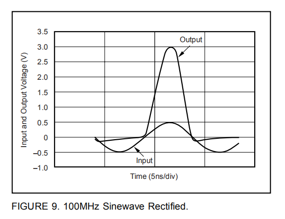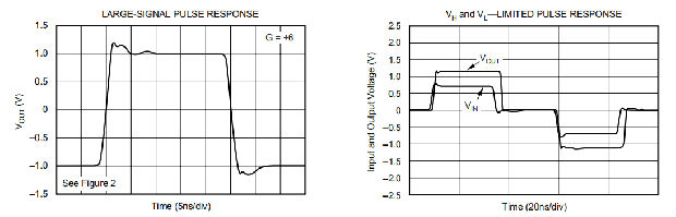 图8中电路的增益设置为+6。图9显示了±0.5V 100MHz输入的输入和输出。