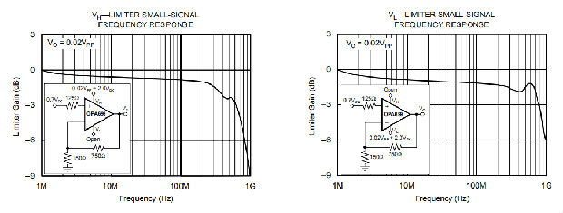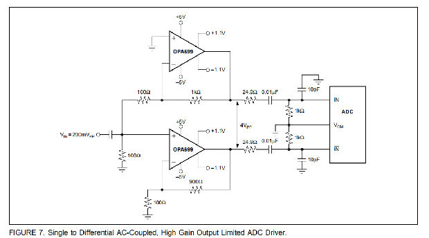 图7显示了一个利用OPA699限制器保护ADC输入的差分ADC驱动程序。使用两个OPA699。第一个是增益为-2的反转配置。第二个是在增益为+2的不可逆配置中。参考“改进型SFDR的低增益补偿”一节,了解OPA699在增益小于4时工作时的稳定性问题的讨论。每个放大器摆动2VPP,提供4VPP差分信号来驱动ADC的输入。限制器设置在远离每个放大器最大信号量100mV的地方,以便在保持可接受的失真水平的同时为ADC提供输入保护。