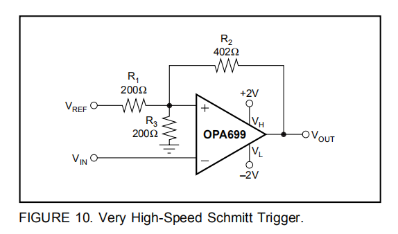 图11显示了施密特触发器在VREF=+5V下工作。这给了我们VHH=2.4V和VHL=1.6V。在施密特触发器配置中,OPA699的传播延迟从高到低是4ns,从低到高是4ns。