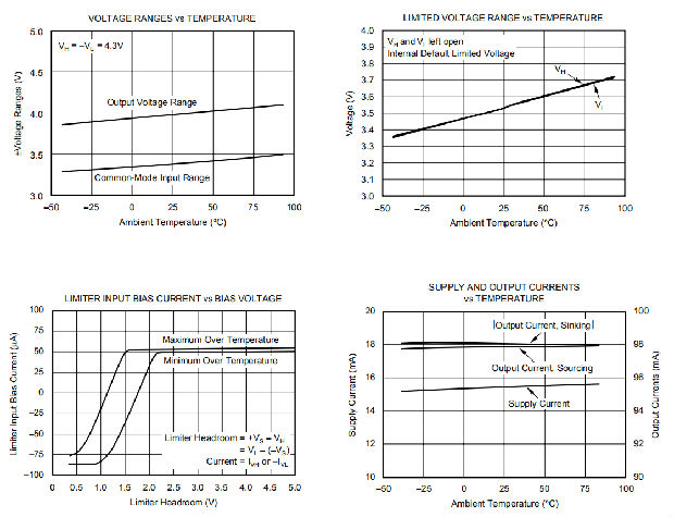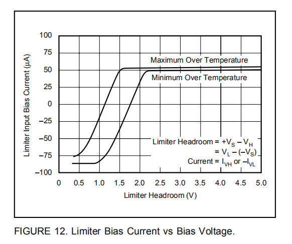当输出电压介于限制电压VH(引脚8)和VL(引脚5)之间时,输出电压与输入线性相关。当输出试图超过VH或VL时,相应的限制器缓冲器控制输出电压并将其保持在VH或VL。因为限制器作用于输出,所以它们的精度不会随增益而变化。从线性工作区到输出限制的过渡非常明显,期望的输出信号可以安全地达到VH或VL的30mV范围内,不会出现非线性。限制器电压可设置在电源的0.7V范围内(VL≥-VS+0.7V,VH≤+VS-0.7V)。它们之间的距离必须至少为400毫伏(VH–VL≥0.4伏)。当插脚5和8保持打开状态时,VH和VL进入默认电压限制;最小值在电气规范中给出。从图12中可以看出零偏电流情况下的预期范围(VS–默认极限电压)=净空。