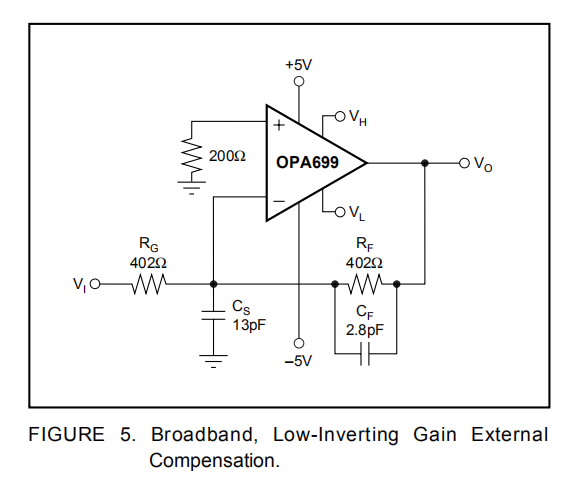 OPA699内部补偿为单位增益稳定,在增益为+6时具有60°的标称相位裕度。相位裕度和峰值在较高增益下改善。回想一下,反转增益为-5相当于带宽增益为+6(即噪声增益=6)。标准的外部补偿技术与此设备一起工作。例如,在反向配置中,可以通过将串联RC网络置于反转节点上的地面来限制带宽而不修改反转增益。这会增加高频噪声增益,从而限制带宽。
