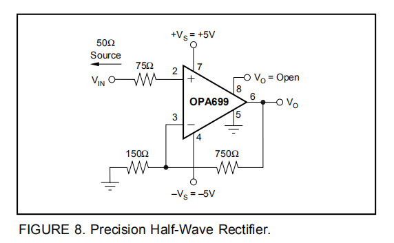 图8显示了一个具有卓越精度和速度的半波整流器。VH(针脚8)通常在打开时默认为3.5,而负极限设置为接地。