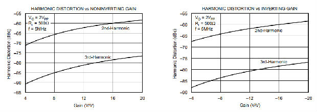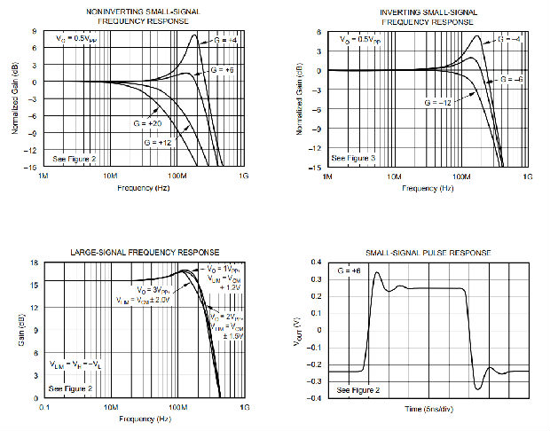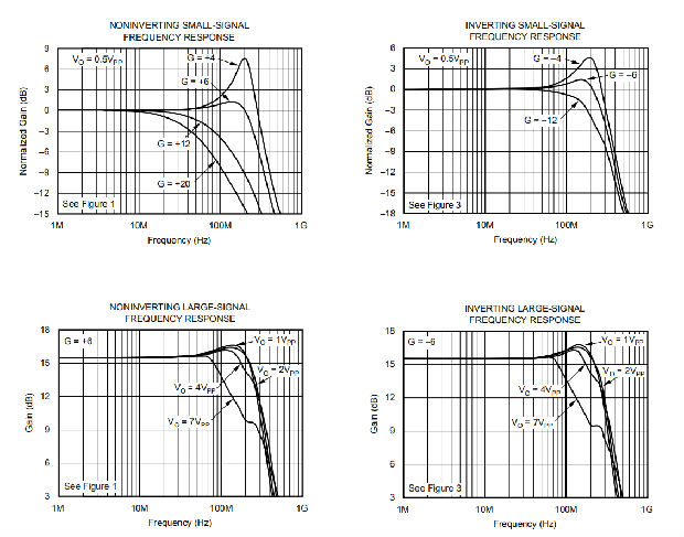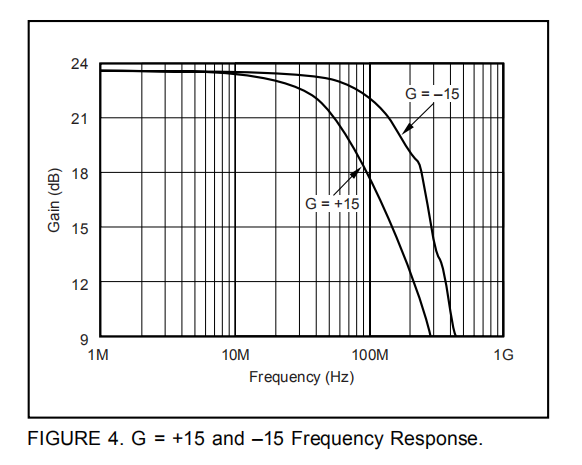 将OPA699作为逆变放大器运行有几个好处,当需要匹配的50Ω源和输入阻抗时尤其有用。图3显示了作为逆变模式典型特性基础的-4V/V电路的逆变增益。