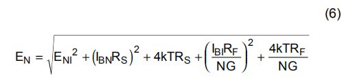将该表达式除以噪声增益(NG=(1+RF/RG))将得到无反转输入时的等效输入参考点噪声电压,如等式6所示。