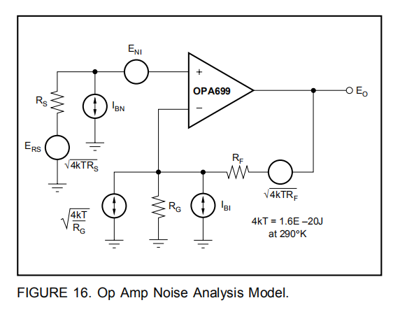 然而,OPA699的4.1nV/√Hz输入电压噪声远低于同类放大器。输入端电压噪声和两个输入端参考电流噪声项相结合,可在各种工作条件下提供较低的输出噪声。图16显示了包含所有噪声项的运算放大器噪声分析模型。在这个模型中,所有的噪声项都被认为是噪声电压或电流密度项,单位为nV/√Hz或pA/√Hz。