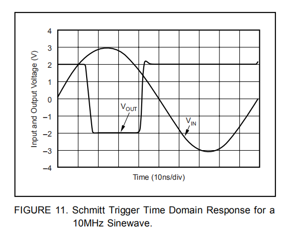 图10显示了一个非常高速的施密特触发器。输出电平被精确定义,开关时间异常。输出电压在VH和VL之间波动。