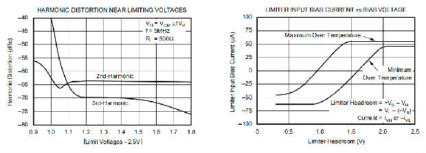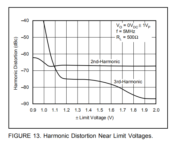 •限制器补偿电压仅轻微降低限制器精度。图13显示了限制器如何影响失真性能。几乎没有观察到线性下降的输出电压摆动到限制器电压。在该图中,当限制器电压对称降低时,驱动一个固定的±1V输出摆幅。在限制器降低到±1.1V之前,几乎没有观察到失真退化。