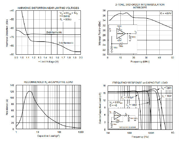 e)、选择低电阻值使电阻及其寄生并联电容设定的时间常数最小。好的金属膜或表面贴装电阻器有大约0.2pF的寄生并联电容。对于大于1.5kΩ的电阻器,这将在500MHz以下增加一个极和/或零。确保输出负载不太重。推荐的750Ω反馈电阻器是大多数设计的良好起点。