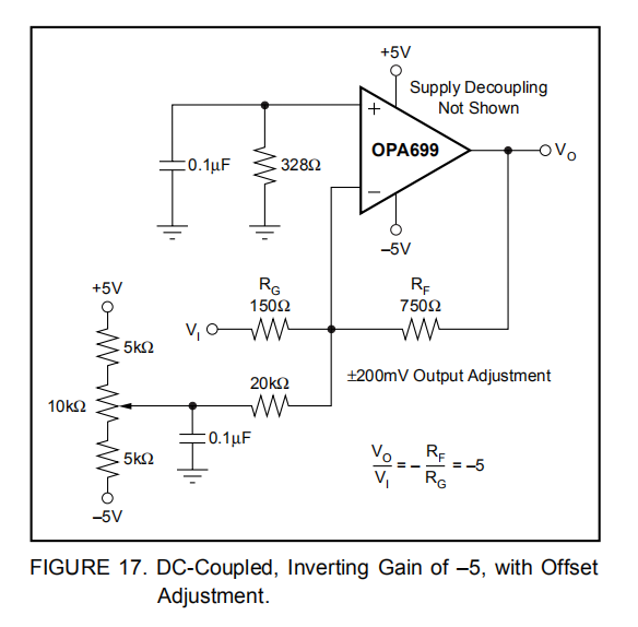 通常需要微调输出偏移零点或直流工作点调整。在运算放大器电路中引入直流偏移控制有很多种技术。这些技术中的大多数最终都是通过反馈电阻增加直流电流。在选择偏移微调方法时,一个关键考虑因素是对期望信号路径频率响应的影响。如果信号路径是非可逆的,则最好将偏移控制作为逆变和信号应用,以避免与信号源的交互。如果信号路径要反转,可以考虑对非反转输入应用偏移控制。然而,求和结上的直流偏移电压会使直流电流返回到电源中,这一点必须加以考虑。对反向运算放大器输入应用偏移调整可以改变噪声增益和频率响应平坦度。对于直流耦合逆变放大器,图17显示了对信号频率响应影响最小的偏移调整技术的一个示例。在这种情况下,直流偏移电流通过比信号通路电阻大得多的电阻值引入逆变输入节点。这将确保调节电路对环路增益和频率响应的影响最小。