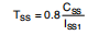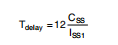 在设备启动时,连接在SS引脚(#4)和接地之间的电容器(Css)为由内部电流发生器ISS1充电,从零到大约2伏夹紧。在这个斜坡过程中,过电流设定点逐渐从零上升到最终值(0.8 V)。过电流设定点达到其稳态值所需的时间,称为软启动时间,大约为: