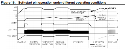 如果过载在SS电压达到5 V之前消失,ISS2发电机将关闭后,电压逐渐降低到2V.A二极管,阳极与SS引脚和连接到VREF引脚(#6)的阴极允许设计者选择其中之一过载时的自动重启模式或闩锁模式行为。如果转换器短路也需要闩锁模式行为,请确保电源在激活闩锁之前,IC的电压永远不会低于UVLO阈值。图18显示了软启动引脚在不同操作条件下的行为。图17显示了结合使用L6591的典型大功率适配器应用程序使用L6563 PFC控制器。