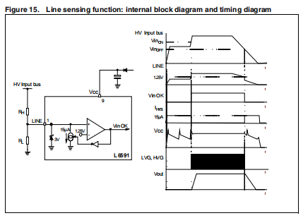 当线路欠压激活时,启动发电机继续工作,但没有PWM活动,因此Vcc电压在启动和UVLO阈值,如图17的时序图所示。当设备运行时,线路引脚是一个高阻抗输入,连接到值电阻,因此它容易拾取噪声,这可能会改变关闭阈值或在ESD测试期间IC意外关闭的原因。可以绕过引脚用一个小的薄膜电容器(例如1-10 nF)接地,以防止任何此类故障。如果不使用该功能,引脚必须通过电阻器连接到VREF引脚(#6)在10到100 kΩ的范围内
