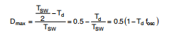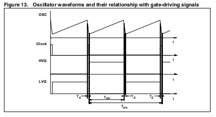 在锯齿波的负向渐变过程中,时钟脉冲被释放。一个T触发器,沿着用逻辑电路,分离奇偶时钟脉冲。偶数的关掉首先是低侧MOSFET,在死时间Td之后,打开高侧MOSFET。正常情况下,高侧MOSFET关闭(低侧MOSFET在死后打开时间Td)响应控制回路;过载时为过电流比较器做的工作或,在开环控制的情况下,奇数时钟脉冲将限制一个振荡器周期内的最大接通时间。这样,最大占空比将为限制在50%以下,变频器的工作频率为振荡器。准确地说,参考图15中的波形,其中Tsw=2/fosc可实现的最大占空比为: