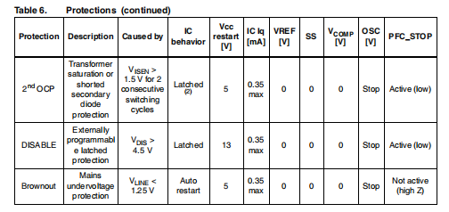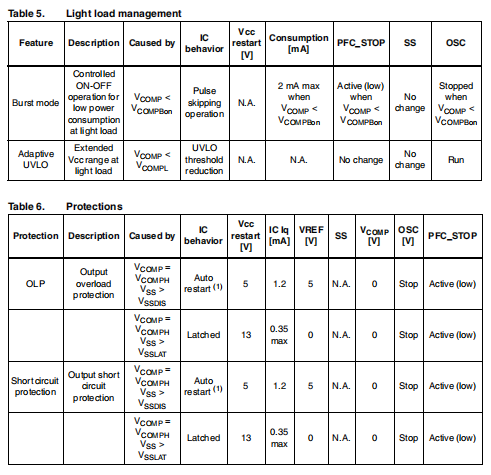 可以看出,该设备具有多种电源管理功能:负载条件、保护功能以及相互作用的不同操作模式带PFC预调节器。为了帮助设计者熟悉这些函数,在下表总结了所有主题及其各自的激活机制和最重要管脚的结果状态。这不仅对正确使用有用但也用于诊断目的:特别是在原型/调试阶段遇到一些不需要的函数激活是很常见的,这些表可以用作快速故障排除指南。