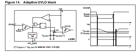 优化转换器以实现最小空载消耗时的一个主要问题是在这些条件下,系统自身产生的电压会大幅下降甚至比几毫安负载。这通常会导致IC的电源电压Vcc下降并低于控制器的UVLO阈值,这样操作就变成断断续续的,这是不受欢迎的。较低的UVLO阈值会有所帮助,但也可能是在大负载下用足够的栅极驱动电压驱动mosfet的问题关闭。为了帮助设计师克服这个问题,L6591除了减少自己的在突发模式操作期间的消耗,还具有专有的自适应UVLO功能。它包括在轻负载下向下移动UVLO阈值,即引脚补偿处的电压低于内部固定的阈值VCOMPL,以便提供更大的净空。防止在从最小值到最大负载正常(较高)UVLO阈值在引脚电压COMP超过VCOMPL(具有一些mV滞后),并且Vcc已超过正常值UVLO阈值(见图16)。正常的UVLO阈值确保在重负载条件mosfet将以适当的栅极电压驱动。