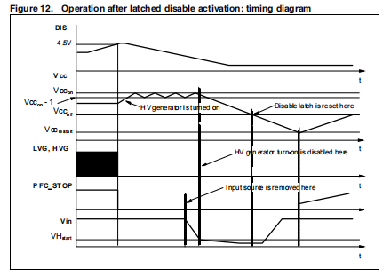 L6591配备有一个比较器,具有外部可用的非反转输入在管脚DIS(#2)处,逆变输入内部参考电压为4.5 V当引脚超过内部阈值时,集成电路立即关闭低值消费减少。信息被锁定,有必要让Vcc引脚上的电压低于重置闩锁并重新启动IC的UVLO阈值。保持闩锁的供应时间变频器与输入电源相连,高压发电机定期启动Vcc在启动阈值VccON和VccON之间振荡–1 V。然后就是需要断开转换器与输入源的连接,以重新启动IC。这次行动如图12的时序图所示。以这种方式激活高压发电机会切断功耗大约为3(与连续的情况相比并使峰值硅温度接近平均值。