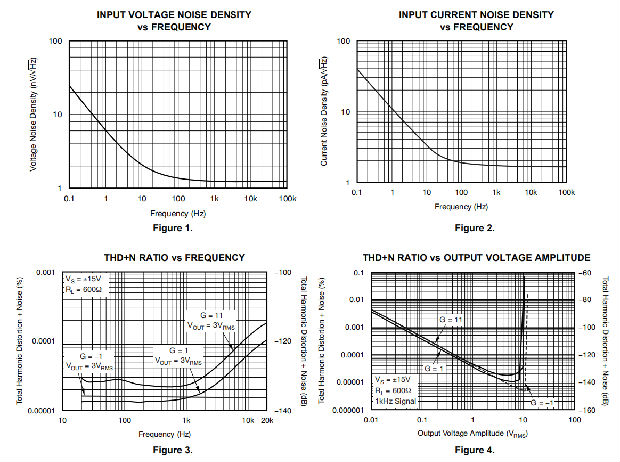 OPA211系列运算放大器具有优良的失真特性。THD+噪声在整个音频范围内低于0.0001%(G=1,VO=3Vrms),20 Hz至20 kHz,负载为600Ω。