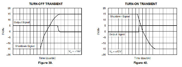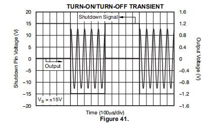 OPA211的关闭(启用)功能参考运算放大器的正电源电压。有效的高电平会禁用运算放大器。有效高电压定义为施加在停机销上的正极电源的(V+)-0.35 V。有效的低电压定义为正极电源引脚下的(V+)-3V。例如,当VCC为±15 V时,设备在12 V或以下启动。设备在14.65 V或以上禁用。如果使用双电源或分体式电源,应注意确保有效的高输入或有效低输入信号正确参考正电源电压。此引脚必须连接到有效的高或低电压或驱动,而不是留下开路。启用和禁用时间在“典型特性”部分中提供(参见图39到图41)。禁用时,输出假定为高阻抗状态。