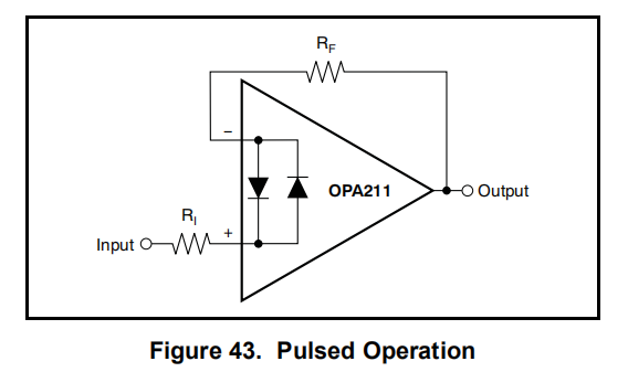 如图211-211所示,OPA-43的输入端与输入端之间存在过大的电压差分保护。在大多数电路应用中,输入保护电路没有后果。然而,在低增益或G=1的电路中,由于放大器的输出不能对输入斜坡做出足够快的响应,所以快速斜坡输入信号可以使这些二极管向前偏移。典型特征图30说明了这种影响。如果输入信号足够快,足以产生这种正向偏置条件,则输入信号电流必须限制在10mA或以下。如果输入信号电流不受固有限制,则可使用输入串联电阻器来限制信号输入现在。这个输入串联电阻降低了OPA211的低噪声性能,并在本数据的噪声性能部分进行了讨论工作表。图43示出实现限流反馈电阻器的示例。