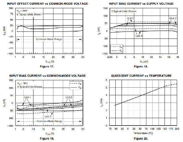共模电压必须保持在规定范围内。此外,关键参数在规定的温度范围内得到保证,TA=–55°C到210°C。典型特性中显示了随工作电压或温度而显著变化的参数。
