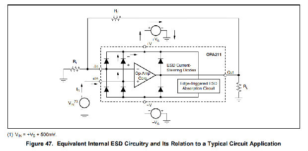 当一个ESD电压在两个或多个放大器器件引脚上形成时,电流流过一个或多个转向二极管。根据电流的路径,吸收装置可能会被激活。吸收装置的触发电压或阈值电压高于OPA211的正常工作电压,但低于器件击穿电压水平。一旦超过这个阈值,吸收装置会迅速启动,并将电源轨上的电压保持在安全水平。