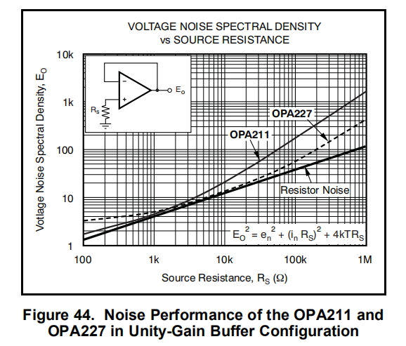 图44描绘了在单位增益配置(没有反馈电阻网络,因此没有额外的噪声贡献)中使用运放的不同源阻抗的总噪声。运算放大器本身同时产生电压噪声分量和电流噪声组件。该电压噪声通常被建模为偏置电压的时变分量。电流噪声被建模为输入偏置电流的时变分量,并与源电阻反应以产生噪音。所以,给定应用的最低噪声运算放大器取决于源阻抗。对于低源阻抗,电流噪声可以忽略不计,电压噪声通常占主导地位。对于高源阻抗,电流噪声可能占主导地位。