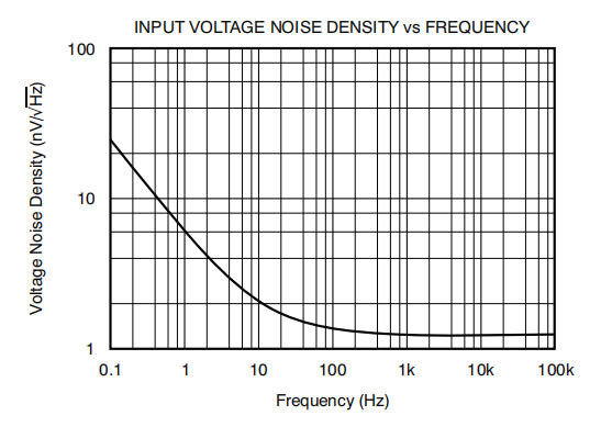源阻抗的电阻部分产生与电阻平方根成比例的热噪声。该函数如图44所示。源阻抗通常是固定的;因此,选择运放和反馈电阻,以尽量减少各自对总噪声的贡献。