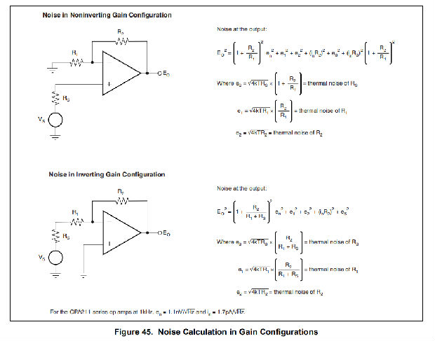 图45说明了带增益的逆变和非逆变运算放大器电路配置。在有增益的电路配置中,反馈网络电阻也会产生噪声。运算放大器的电流噪声与反馈电阻反应,产生额外的噪声分量。通常可以选择反馈电阻值,使这些噪声源可以忽略不计。给出了两种结构的总噪声方程。