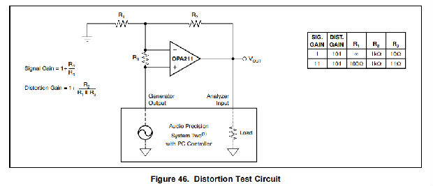 OPA211系列运算放大器产生的失真低于许多商用失真分析仪的测量极限。然而,图46所示的特殊测试电路可用于扩展测量能力。